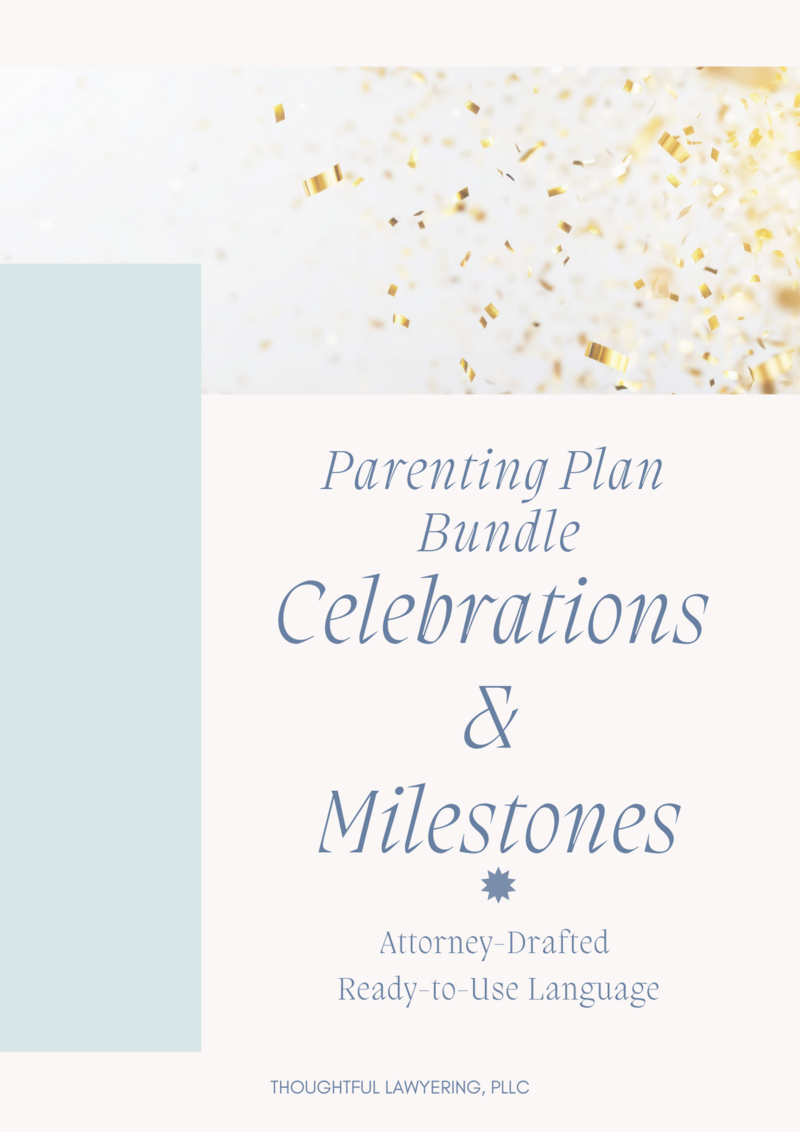 This parenting plan bundle focuses on celebrations and milestones like birthdays, graduations, school events, and other special occasions. It includes thoughtful, customizable provisions to help parents plan ahead and avoid conflict. Whether you're creating a new plan or updating an existing one, this bundle gives both parents the tools to plan ahead and share in life’s most memorable occasions.