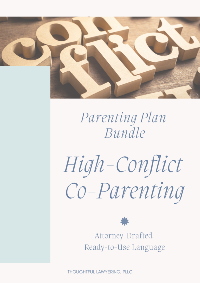 This high-conflict parenting plan bundle is designed to minimize disputes and establish clear, enforceable expectations. It includes provisions addressing exchanges, communication boundaries, romantic partners, substance use, and shared expenses. Whether you're creating a new plan or updating an existing one, this bundle helps establish structure, reduce miscommunication, and protect your child(ren)’s well-being in high-stress co-parenting situations.