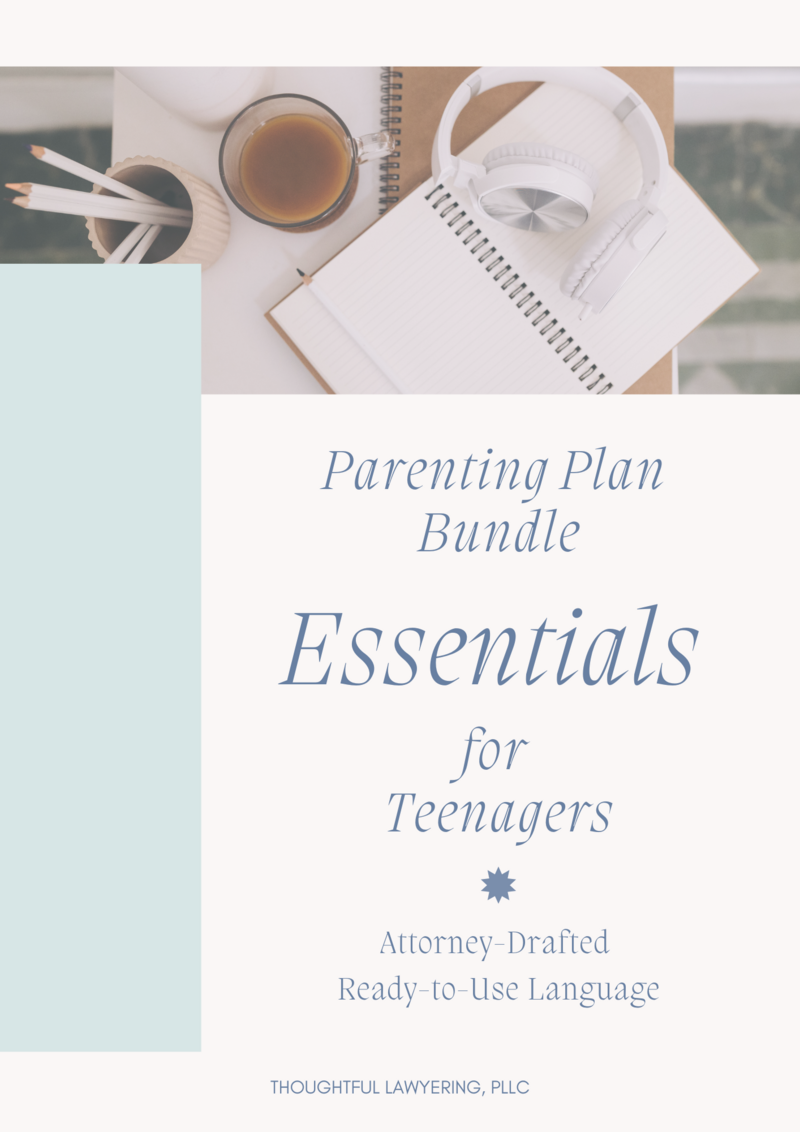 This parenting plan essentials bundle is designed specifically for parenting teenagers. It includes age-appropriate provisions covering custody, visitation, extracurricular commitments, employment, driving privileges, use of electronics, communication, and celebrating milestones. Whether you're creating a new plan or updating an existing one, this bundle provides clear, customizable language to support co-parenting during your teen’s increasingly independent years.